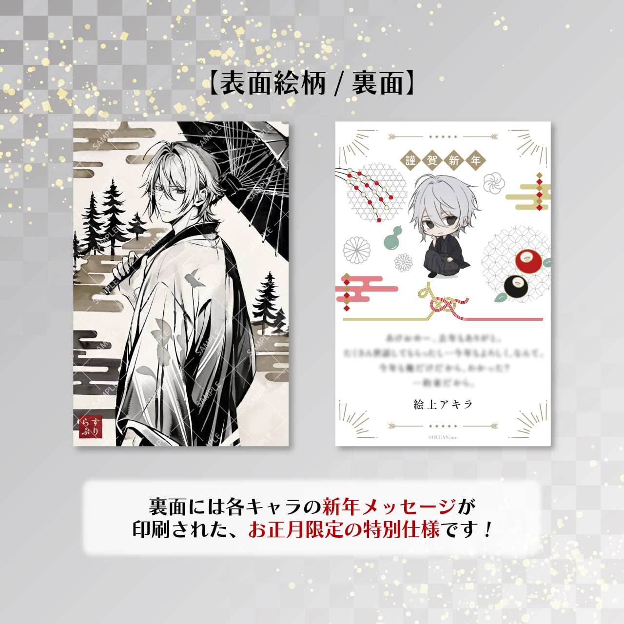 表面には筆墨風タッチで描かれた和装姿の彼が、裏面にはお正月のモチーフに彩られたミニキャラと、彼からの特別な年始メッセージを添えてお届けします。