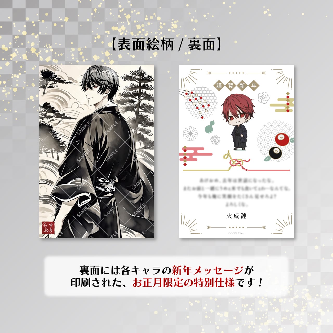 表面には筆墨風タッチで描かれた和装姿の彼が、裏面にはお正月のモチーフに彩られたミニキャラと、彼からの特別な年始メッセージを添えてお届けします。