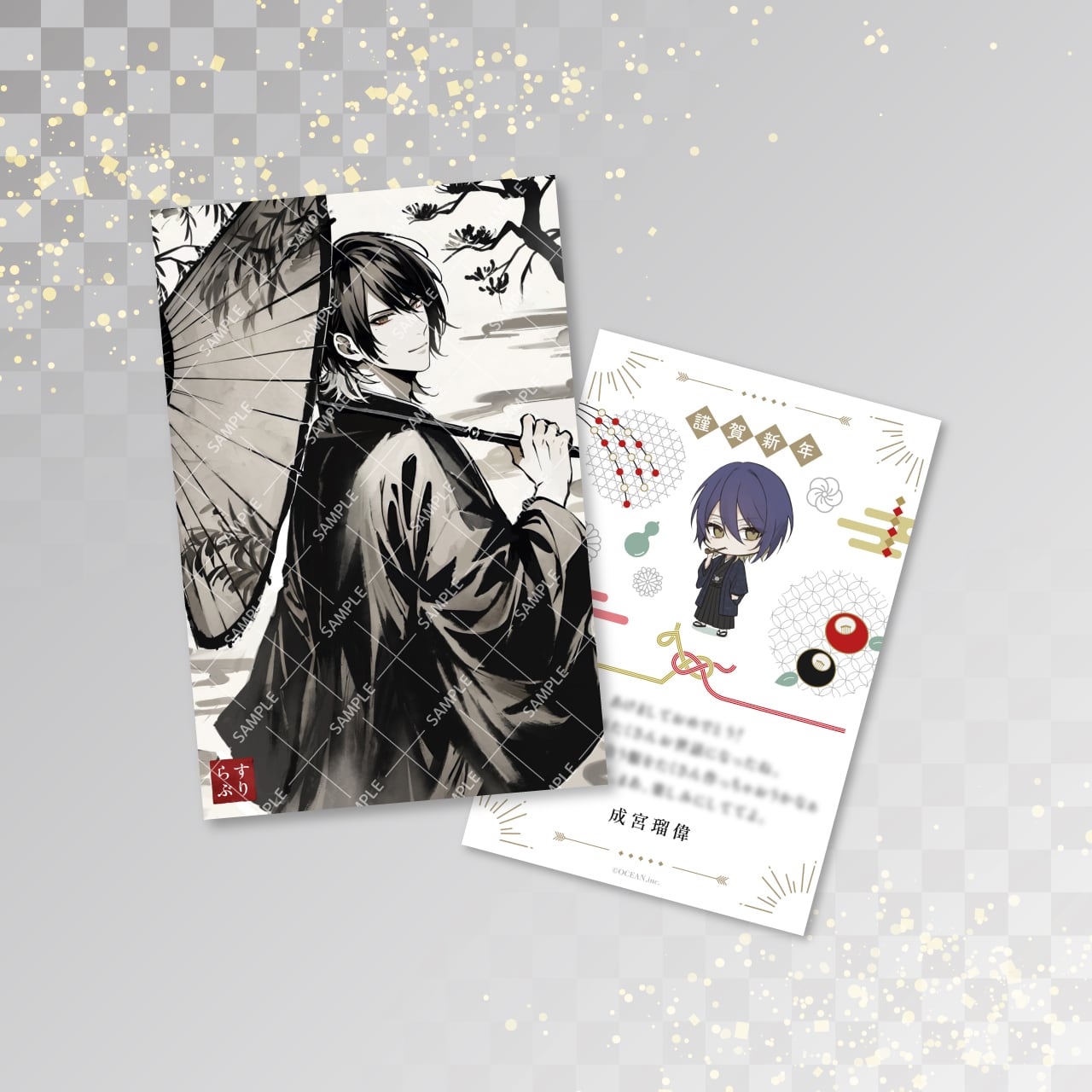 表面には筆墨風タッチで描かれた和装姿の彼が、裏面にはお正月のモチーフに彩られたミニキャラと、彼からの特別な年始メッセージを添えてお届けします。