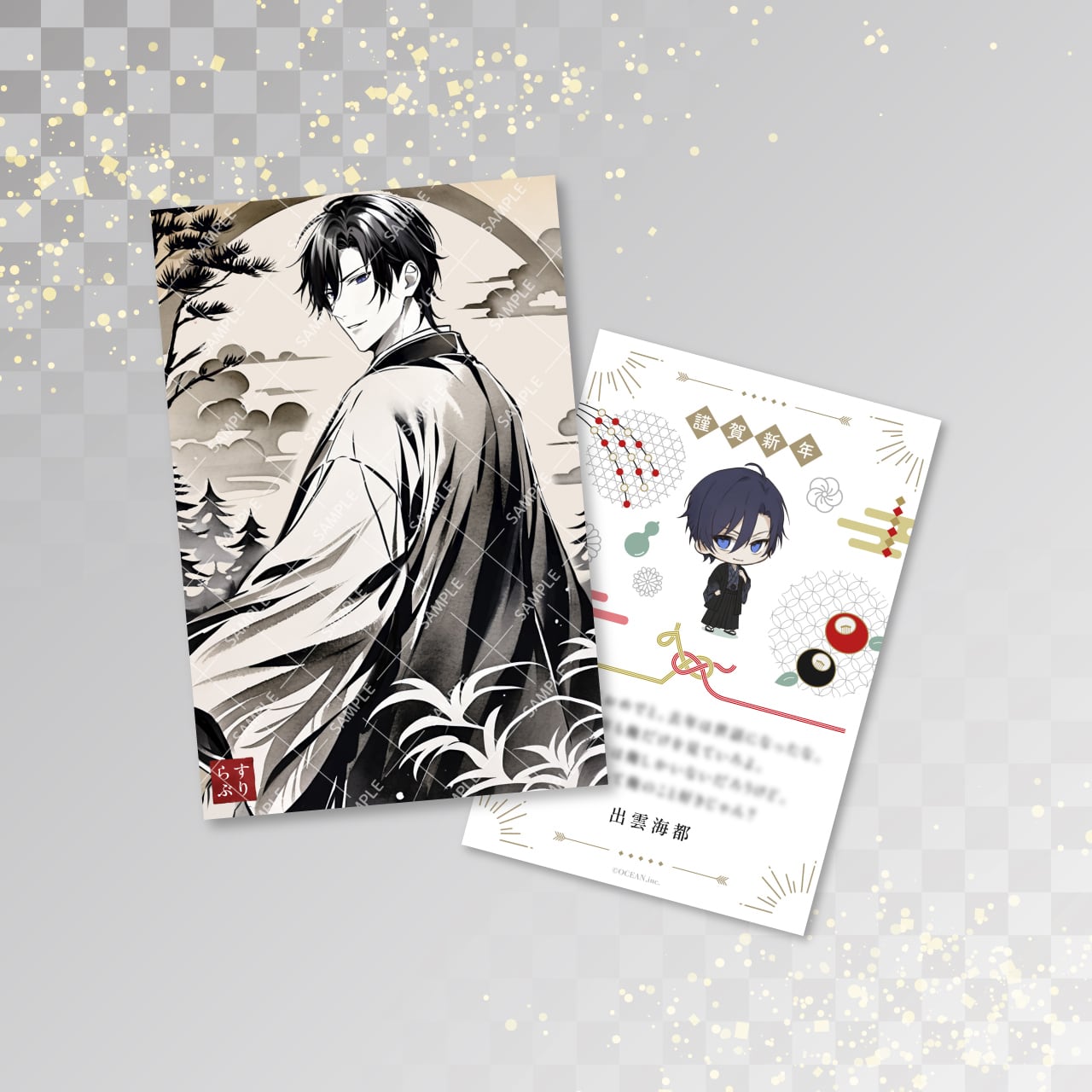表面には筆墨風タッチで描かれた和装姿の彼が、裏面にはお正月のモチーフに彩られたミニキャラと、彼からの特別な年始メッセージを添えてお届けします。