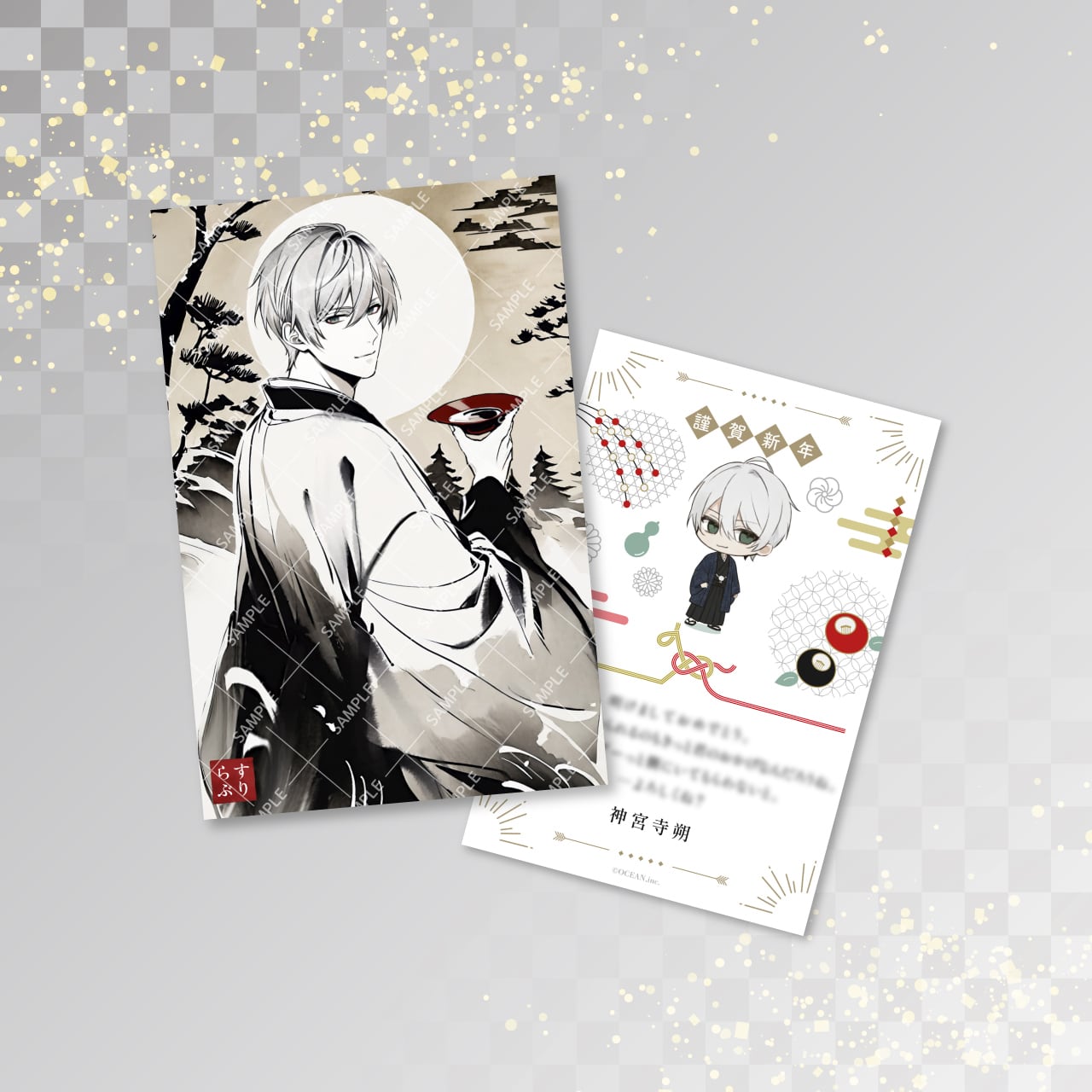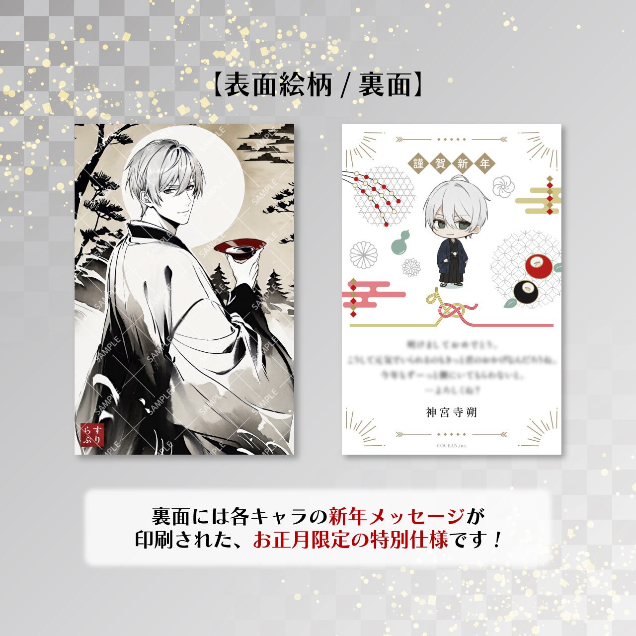 表面には筆墨風タッチで描かれた和装姿の彼が、裏面にはお正月のモチーフに彩られたミニキャラと、彼からの特別な年始メッセージを添えてお届けします。