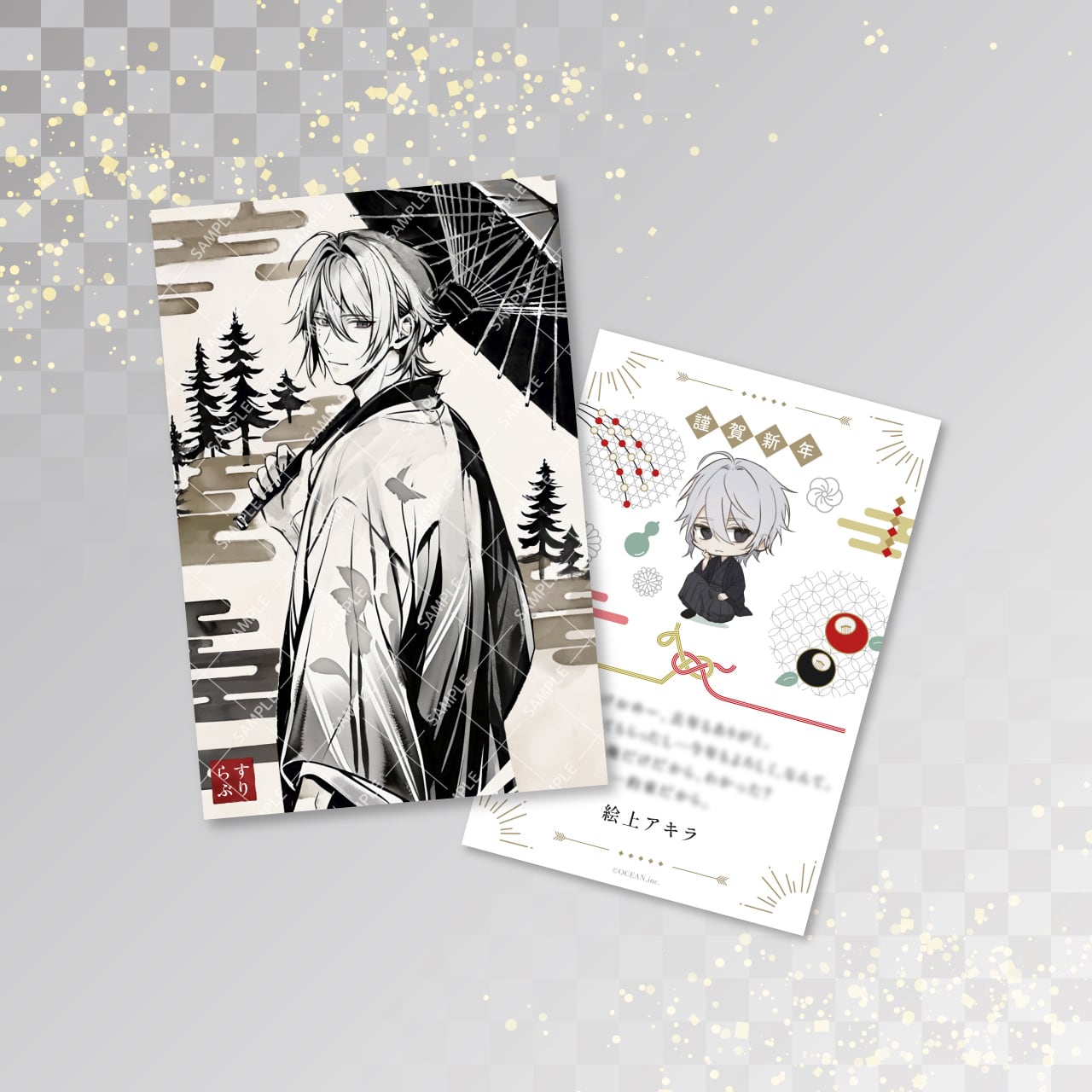表面には筆墨風タッチで描かれた和装姿の彼が、裏面にはお正月のモチーフに彩られたミニキャラと、彼からの特別な年始メッセージを添えてお届けします。