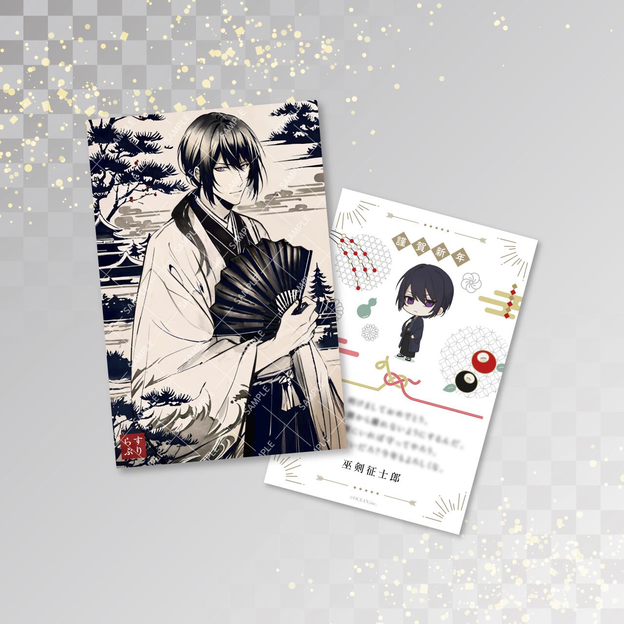 表面には筆墨風タッチで描かれた和装姿の彼が、裏面にはお正月のモチーフに彩られたミニキャラと、彼からの特別な年始メッセージを添えてお届けします。