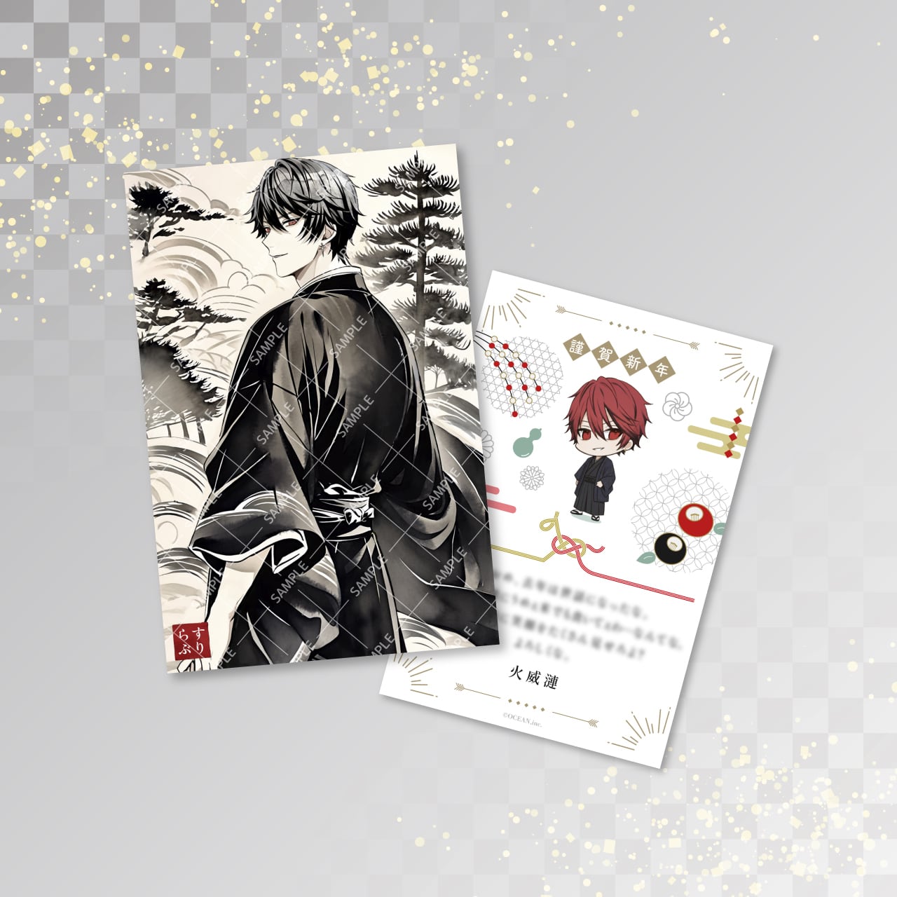 表面には筆墨風タッチで描かれた和装姿の彼が、裏面にはお正月のモチーフに彩られたミニキャラと、彼からの特別な年始メッセージを添えてお届けします。