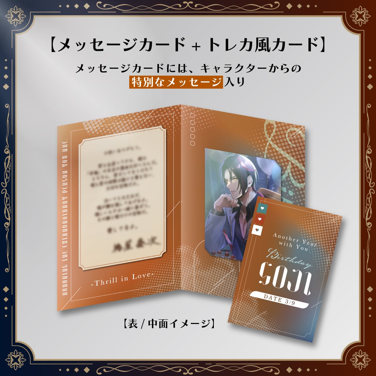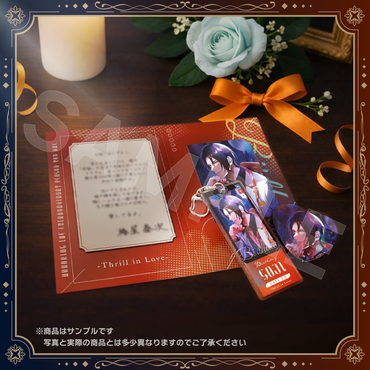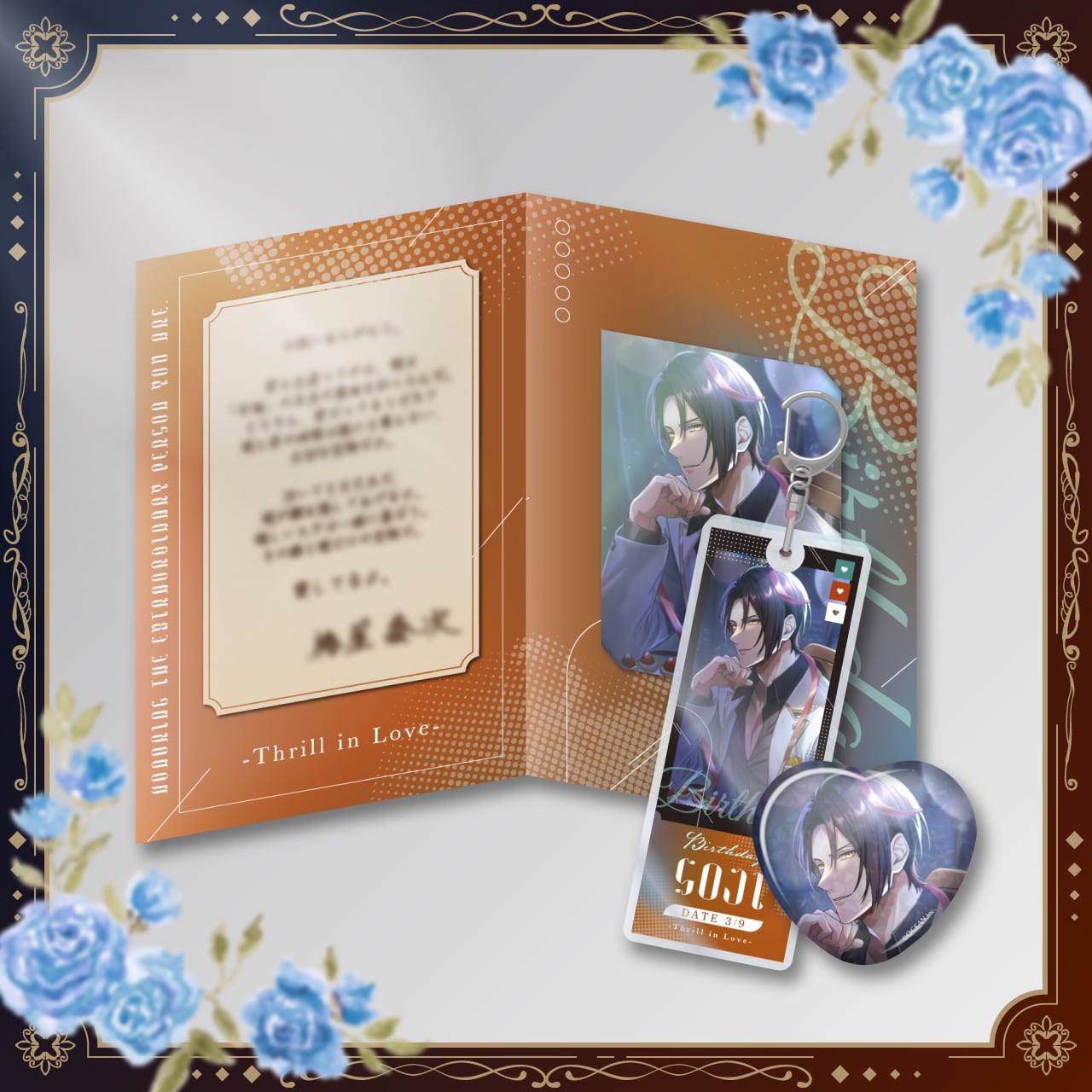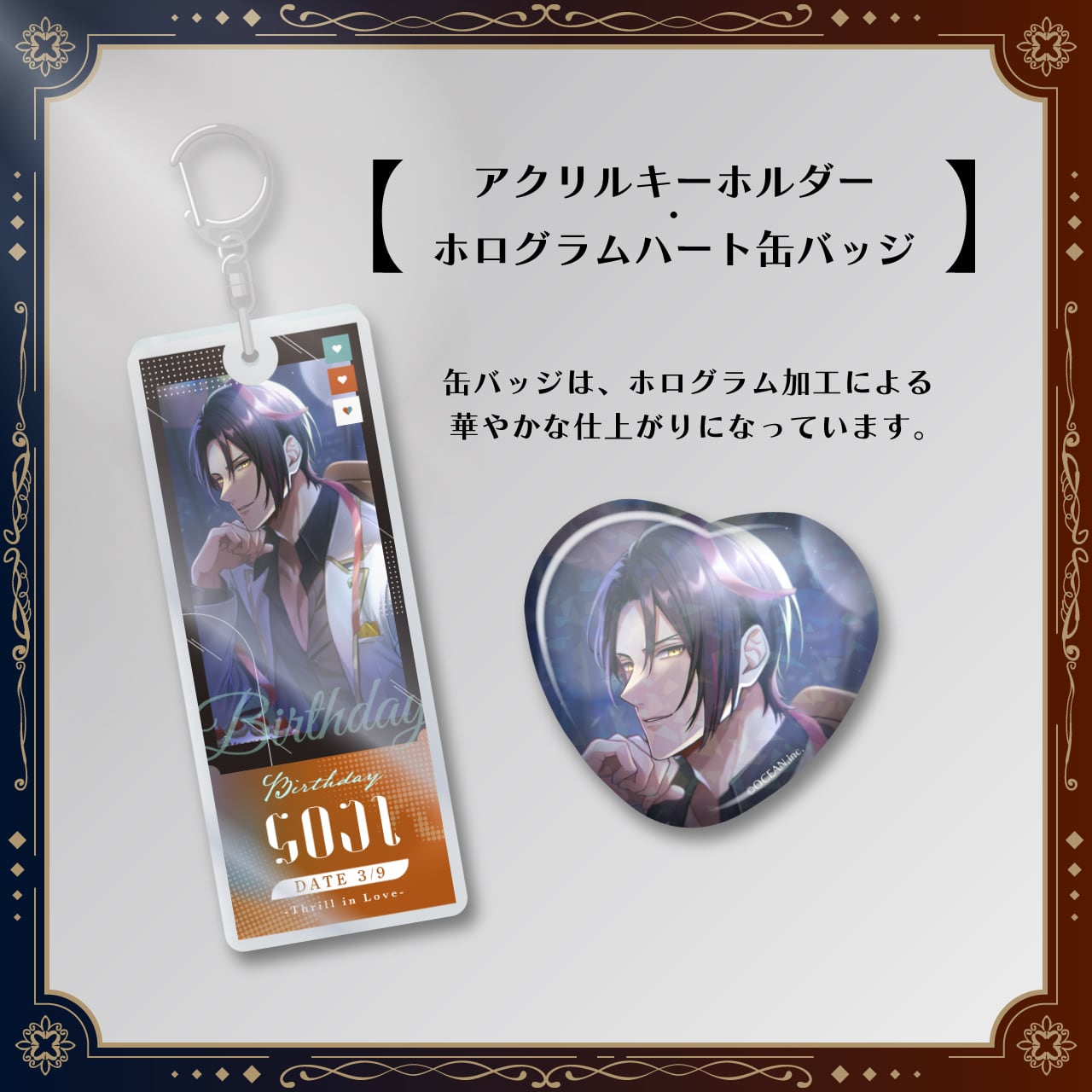 キャラクターの誕生日を記念して、昨年のバースデースチルを使用した【アクリルキーホルダー・ホログラム缶バッジ・メッセージカード】をセットにしました。